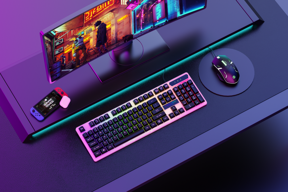 يتميز الكيبورد بمفاتيح ملونة بإضاءة خلفية تتيح لك الاستمتاع باللعب في البيئات ذات الإضاءة الخافتة. يأتي أيضًا مع ماوس وعجلة دوارة ثلاثية الأبعاد غير قابلة للانزلاق مصممة لتستجيب بسرعة لحركة أصابعك.