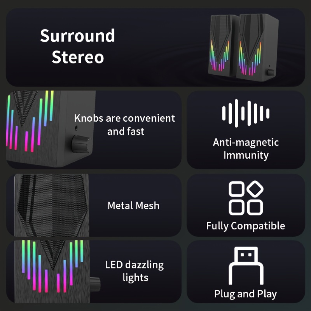 سماعات بقدرة 2*3 واطاضاءهقطر السماعه الداخلي 40 مممنفذ التشغيل 3.5مممنفذ USB لتزويد الطاقه فقطامكانية توصيل سماعة رأس